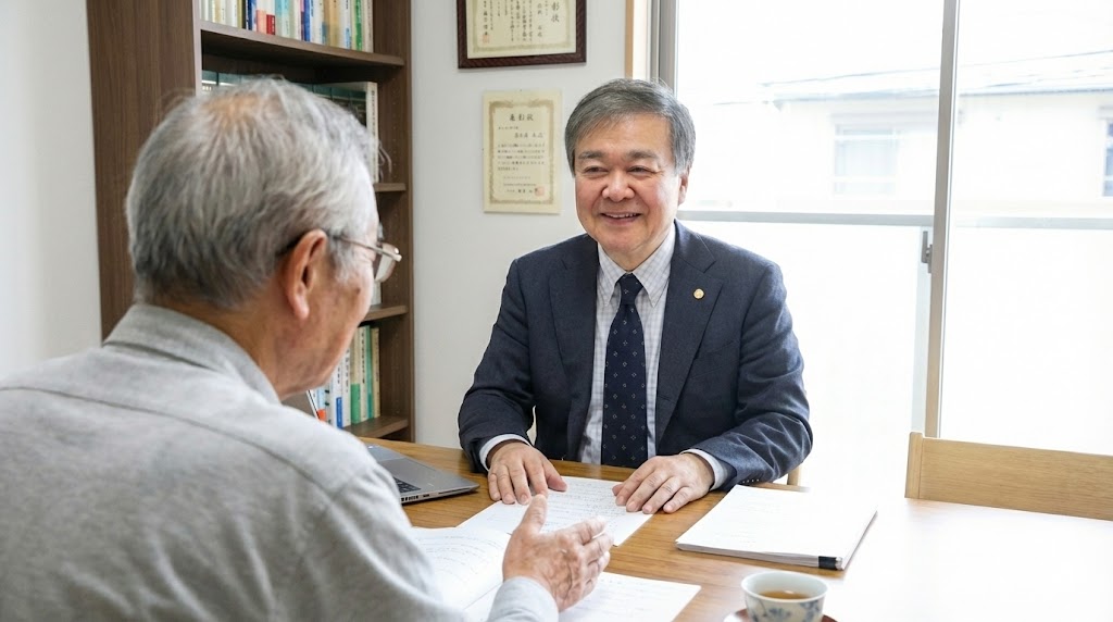 1. 40年のサラーリーマン経験で得られた、皆様目線の対応力。お客様の多くが望まれていることは、法律の条文を暗唱出来る専門家ではなく、自分の悩みを行間まで汲み取り、現実的な解決策を提示してくれるパートナーであります。このことは当事務所の特長であり、最大の目標です。